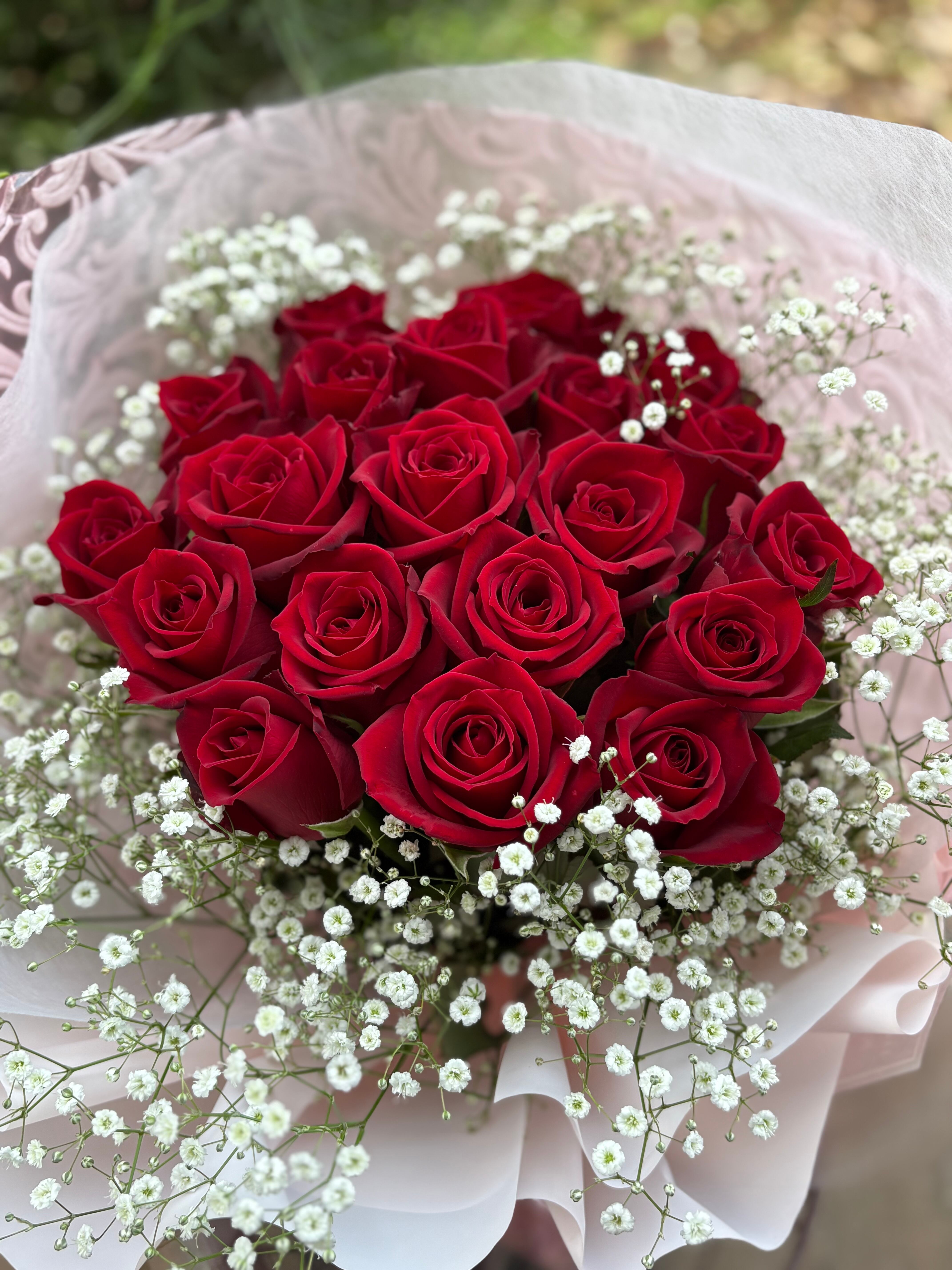 バラの華やかさとかすみ草の可憐さが、特別な日の思い出に華を添えます。